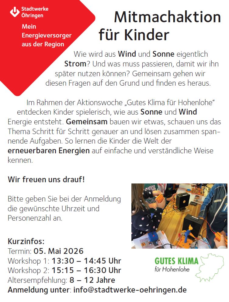 Auch dieses Jahr wird es wieder eine hohenloheweite Aktionswoche “GUTES KLIMA FÜR HOHENLOHE” geben und die Stadtwerke Öhringen sind dabei!